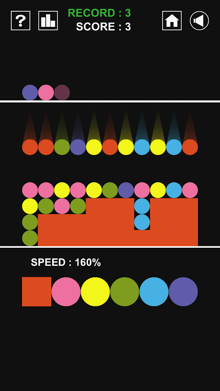 - Circles of 6 colors come down from the top of stage. Destroy circles before stage is full.