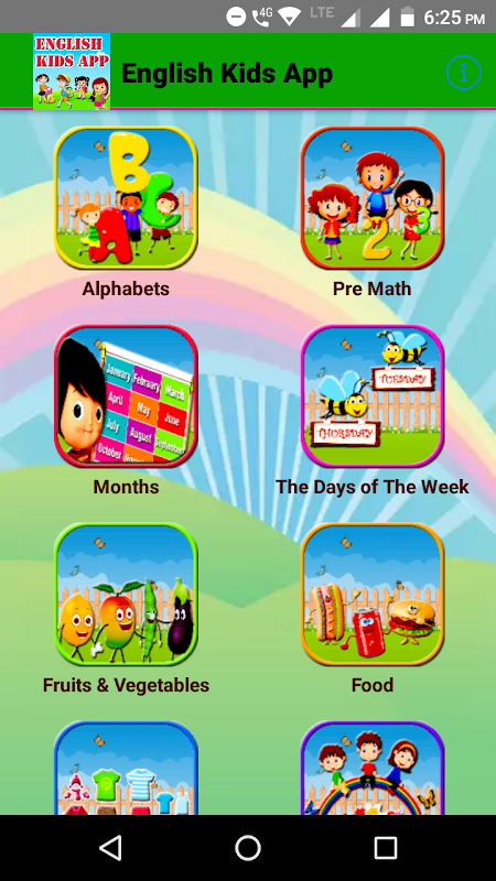 このアプリは、英語のアルファベット、Kids Pre Math、Kids math、English Numbers、English Months、Days of the Week、Fruits&Vegetables In English、Food、Clothes、Flowers、Vehicle、Birds、Animals、Colors、Shapes、職業、コンピューター、一年の季節、学校の文房具、子供のための良い習慣、魔法のスレートと道順も子供のためのゲーム、子供のためのスペル学習、子供のための描画と絵画、