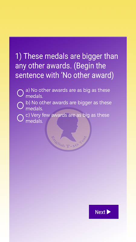 English T 10 Test is an English grammar test. In this app have a 10 Test.