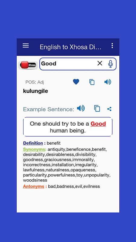 英語からコサ語およびコサ語から英語のオフライン辞書。また、単語の意味で利用可能な意味のある画像を表示します。ユーザーフレンドリーなインターフェースと簡単な検索システム。