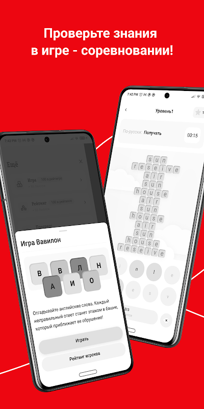単語を効果的に暗記するために、アプリケーションには 5 つの異なるゲーム メカニクスが実装されています。各単語にはテーマ別のイラスト、発音、テキストの例が付いています。指定されたトピックに関して提案された単語を学習したり、学習する単語の独自のリストを作成したりできます。