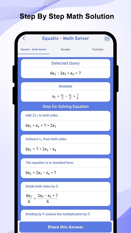 - PDF の作成: すべての方程式と解を PDF として保存し、簡単に共有したり後で参照したりできます。