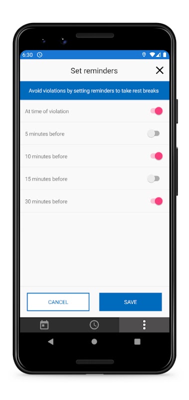 疲労管理を簡素化します。アラートと信号機インジケータは、運転手がログブックの規則と規制に準拠するのに役立ちます