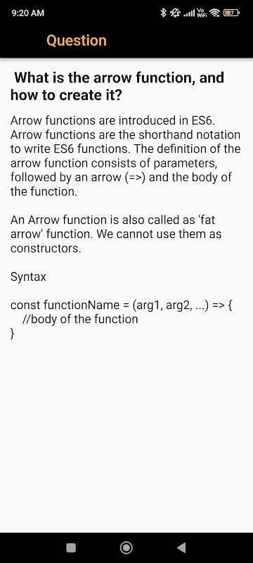 ES6 のインタビューの質問: ES6 に特に興味がある人のために、アプリには ES6 の概念に焦点を当てた 100 以上の質問を含む専用セクションが含まれています。 ES6 の面接シナリオに対する知識を深め、自信を高めます。
