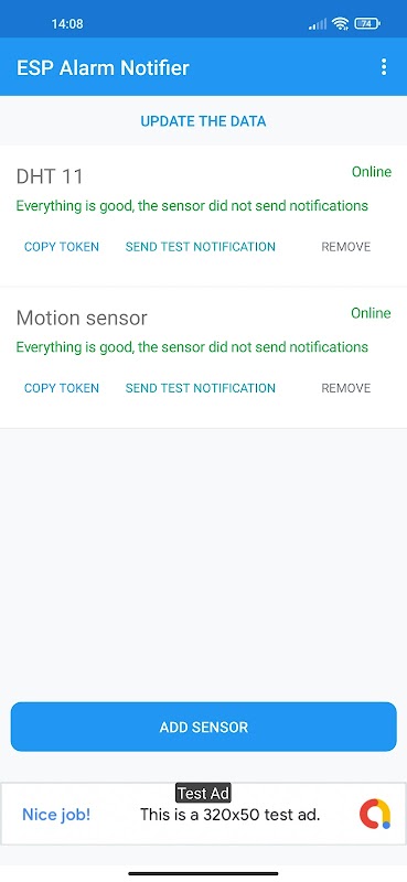 This application sends push notifications and starts an alarm ringtone on your phone if your sensor based on the ESP microcontroller sent an alarm request.