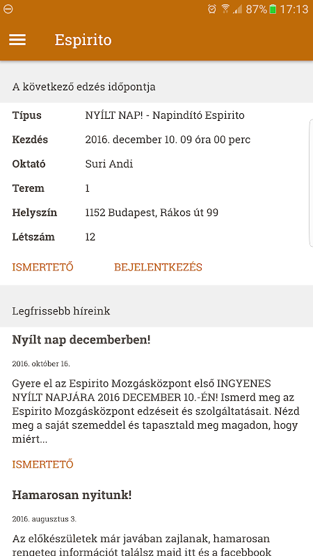 Az Espirito Mozgásközpont a fővárosnak egy olyan aprócska szigete, ahol az edzés elsősorban élmény, ahová az emberek nemcsak azért járnak, hogy sportoljanak és változtassanak az életmódjukon, hanem azért is, hogy egy Csapat, egy Közösség részei legyenek. Itt senki senkit nem néz ki azért, mert régi a melegítője, vagy mert túlsúlyos. Mindenkit elfogadunk, aki szeretne egy összetartó közösség tagjaként sportolni és/vagy életmódot váltani. A cél, hogy mindenki elérje azt a célt, amiért ide jön, és ehhez minden segítséget meg is adunk, amit csak tudunk.