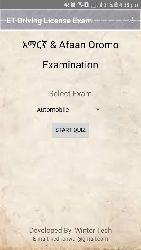 የመጀመሪያው ባለብዙ አማራጭ የመንጃ ፍቃድ ፈተና መለማመጃ መተግበሪያ በሁለት ቋንቋ አማራጮች እነሱም በአማርኛ እና በአፋን ኦሮሞ በ 10 የተለያዩ ምድቦች ከ 3 ሺህ በላይ ጥያቄዎች እስከ መልሶቻቸው እነሱም ህዝብ -1 ፣ የህዝብ ማመላለሻ ፣ ደረቅ ጭነት ፣ ቴክኒክ ፣ መረጃ ፣ ህግ ፣ ሳይኮሎጂ እና ሌሎችም ትምህርታዊ ጥያቄዎች እና መልሶቻቸውን በዚህ ልዩ የሙያ መስክ ዕውቀትን ለሚፈልጉ ሁሉ በጥንቃቄ የተዘጋጀ::