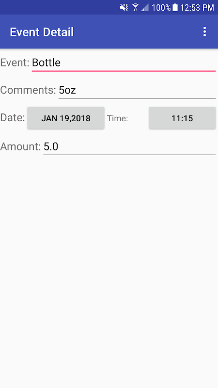 This is an event tracking application, which allows the user to create a daily list of events. Events can include a decimal amount, a date and time, and an extra comment. Events from a specific day or from a range of days can be displayed. The app can calculate the totals of the amounts for each type of event and the average of these amounts for the events currently being displayed.
