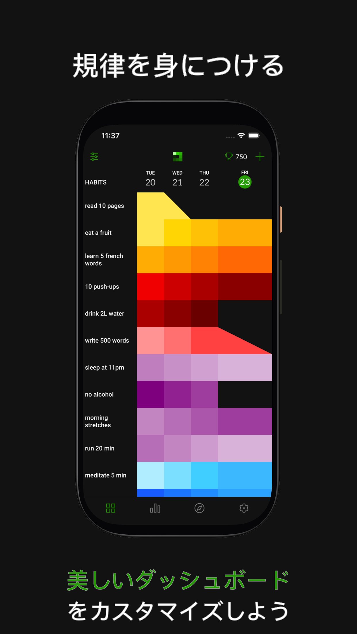 - ダッシュボードをカスタマイズ:ツールを個人個人のニーズに合わせる。習慣を並べ替えることによって、優先順位を付けたり、カテゴリでまとめたりできます。色は、ダッシュボードをより美しく見せるためだけでなく、カテゴリごとに習慣をグループ化するためにも使用できます。 「習慣を破る」オプションをご利用になれば、色が下がっていくストリークも作成できます。