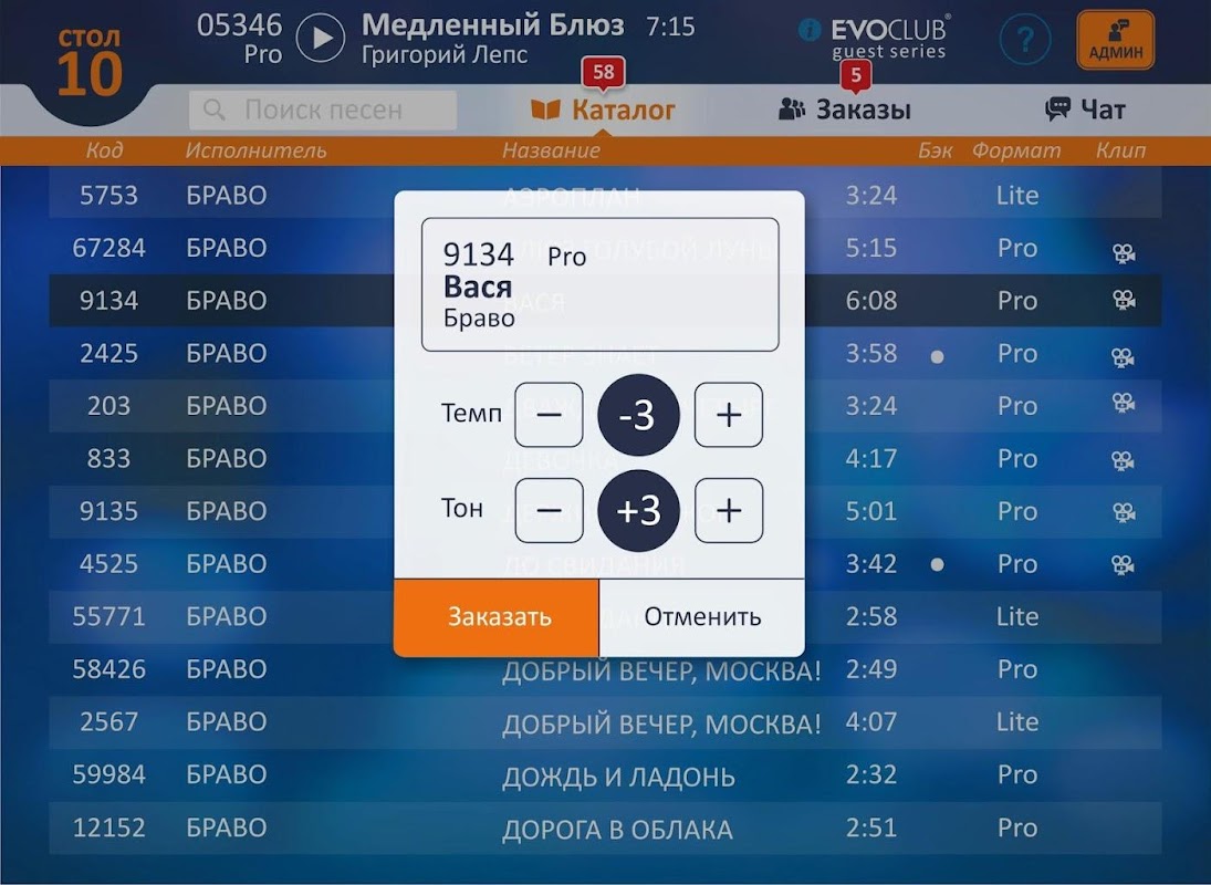 「EvoClub」はカラオケ曲の電子カタログで、サウンドエンジニアに注文を送ることができます。また、Wi-Fiネットワーク上でクラブのゲスト間の内部チャットもできます。