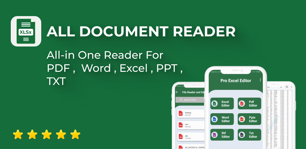 This tool quickly show you all word documents, pdf reader, excel reader, pptx and all documents reader with fast loading time of xlsx file viewer and xls viewer app.