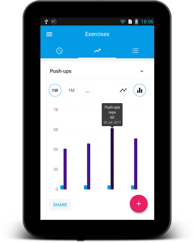 ワークアウトプログレストラッカーには、すでにプッシュアップやプルアップ、スクワットとサングラス、腹部と上腕二頭筋のようないくつかの最も一般的な練習が含まれています。しかし、他のフィットネストレーニングトラッカーのほとんどとは異なり、この1つの主な利点は、あなたのニーズに合った自分のエクササイズを作成する能力です。ベンチプレス、ベンチディップ、デッドリフト、レッグプレス、厚板、お気に入りのカーディオ、クロスフィット、ストレッチ、ピラティス、タバタ、HIITトレーニング、または録音したいその他のエクササイズを追加するだけです。