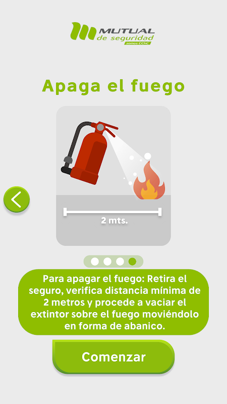 3. 火を消す: 保険を外し、最低距離が 2 メートルであることを確認し、消火器を扇の形に動かして火を消します。