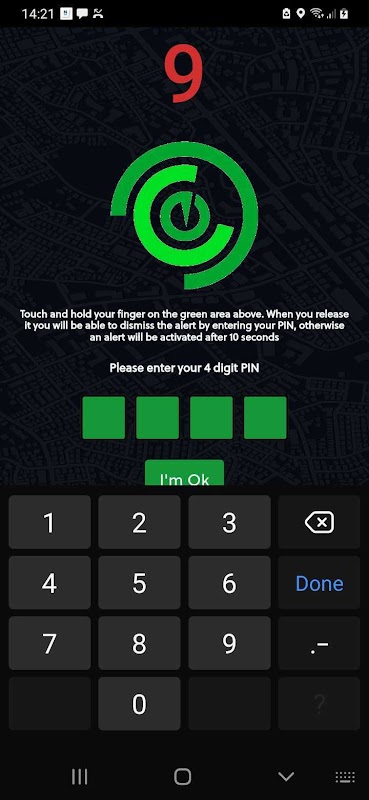 この機能を使用すると、携帯電話のデッドマントリガーアイコンに指を置いたままにすることができます。危険にさらされているときにトリガーボタンから指を離すと、10秒間のカウントダウンが開始されます。独自のコードEyerusを入力しない場合、ユーザーがサブスクライブしたアラートモードに自動的にエスカレートします。