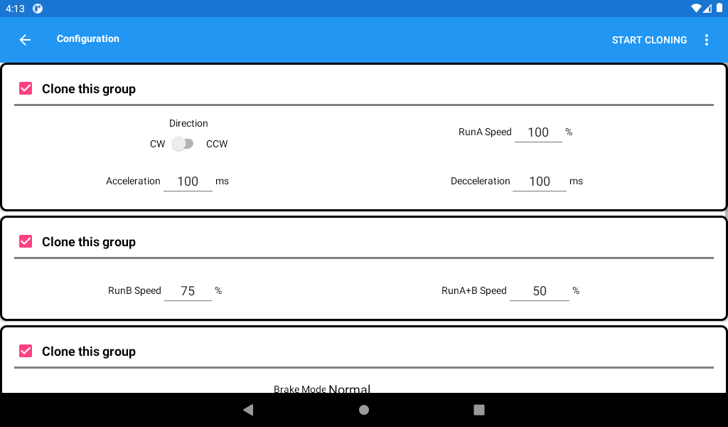 The app works with EZQube wireless modules from the Pulseroller family of controllers. It is used to clone a user-defined configuration, or the configuration of another wireless EZQube module, to all discoverable (modules which are in range) modules via Bluetooth.