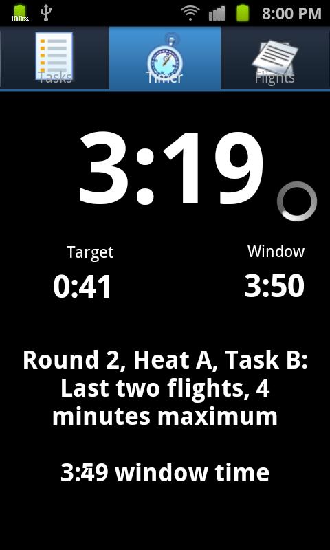 Select from the available official F3K tasks, special practice tasks, or configure your own. The timer displays and calls out your flight, window and target times as they change throughout the task. Target time is adjusted where necessary as you progress through the task.