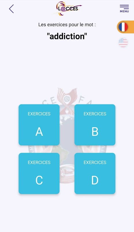 ユーザーはフランス語または英語で単語を入力して、学習した単語を構成する表現または文のデータベースにアクセスします。今日、1,500の入場があります。これらの初期データは徐々に強化され、フランス語と英語のペアとして、フランス語と英語で類似した書き方の単語のペアが含まれます。これにより、学習者はそれらを視覚的に覚えやすくなります。これらの単語は、その言語で最も一般的に使用される単語をリストした頻度辞書を使用して選択されました。 LSFとASLのビデオクリップは、両方の手話のすべての単語、フレーズ、文に相当するものを示しています。すべては、学習を強化するための活動を伴います。演習A、B、C、およびDのアクティビティのソリューションは、アプリケーション自体で提供されます。個別に実行できる演習CとDの場合、ユーザーはコンソーシアムプラットフォームでソリューションを見つけることもできます。また、新しい演習Eもあり、後で他の演習が続きます。