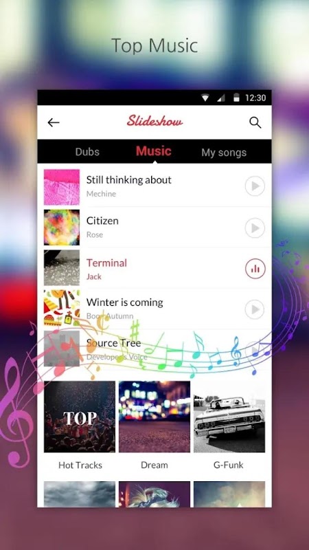 ➩ thousands of fully licensed music. You can also add local songs from your device. The comprehensive catalog and local music makes online video clips fun and popular.