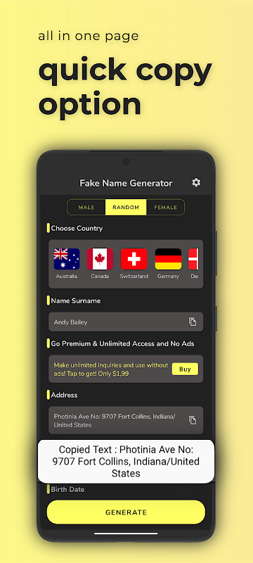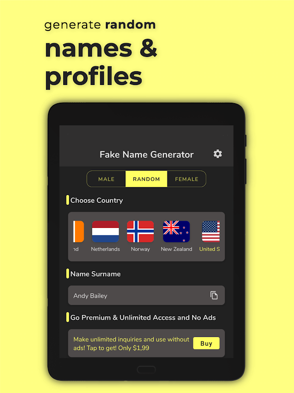 アプリは、選択した国と性別で最も人気のある名前と名前を使用し、ランダムな組み合わせを作成します(数千になります!)。ランダムな名前ピッカーと偽の名前ジェネレータデータベースはまだ拡張中です。