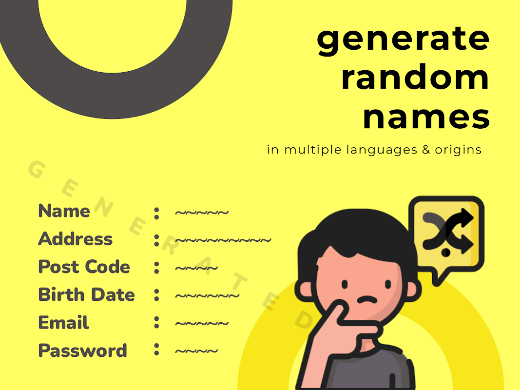 偽の名前ジェネレーターは完全に無料で、ランダムな名前ピッカーアプリをダウンロードするとすぐにすべての機能を利用できます。ランダムネームジェネレータは、ソーシャルダミープロファイルの名前のホイールからランダムで偽の名前を生成します