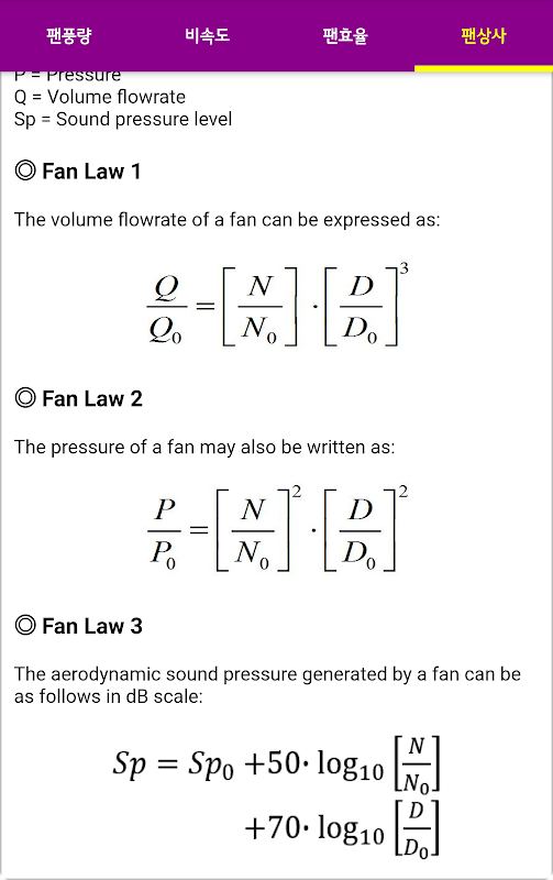 ファン風量、作動条件に応じた比速度でファンタイプ選定、ファン効率測定、作動条件変化に応じた圧力と風量変化式提供する。