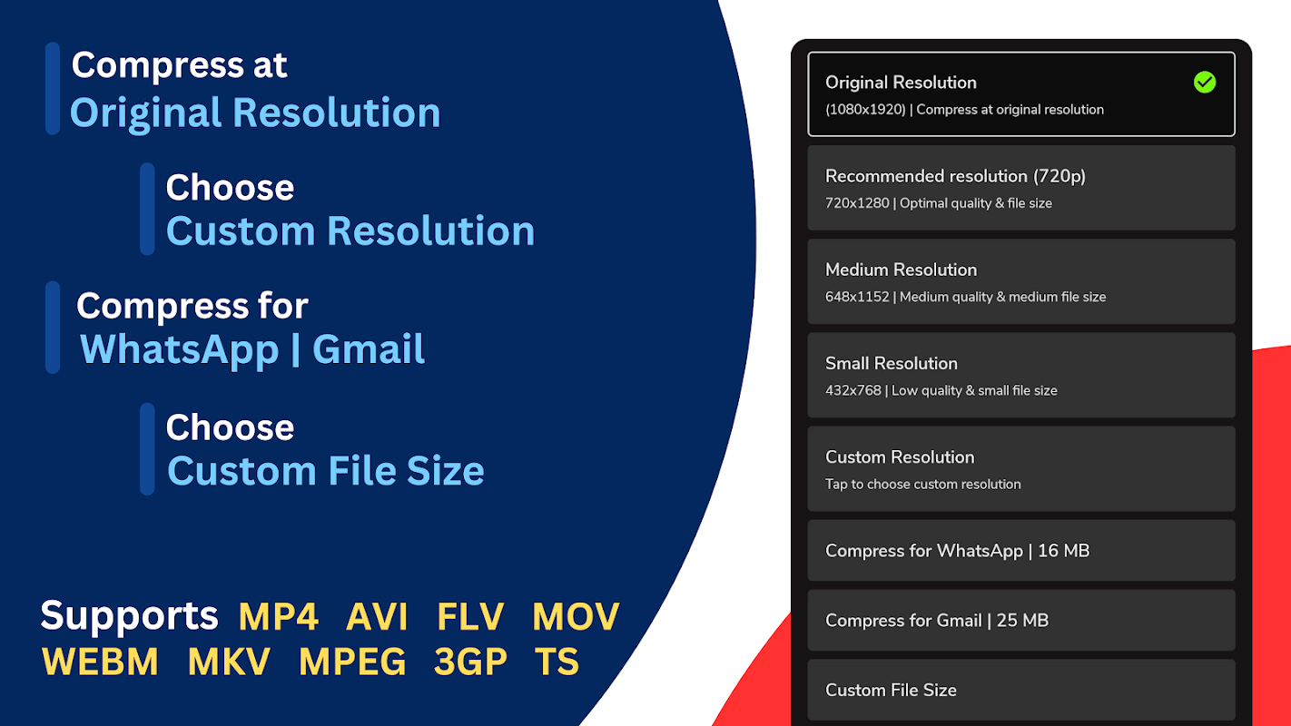ビデオを共有するための特定のファイル サイズ要件がありますか?問題ない! Proton Video Compressor for Android はカスタム ファイル サイズ オプションを提供しており、ビデオを希望のサイズに圧縮できます。事前定義された解像度の範囲から選択するか、独自のパラメータを設定します。