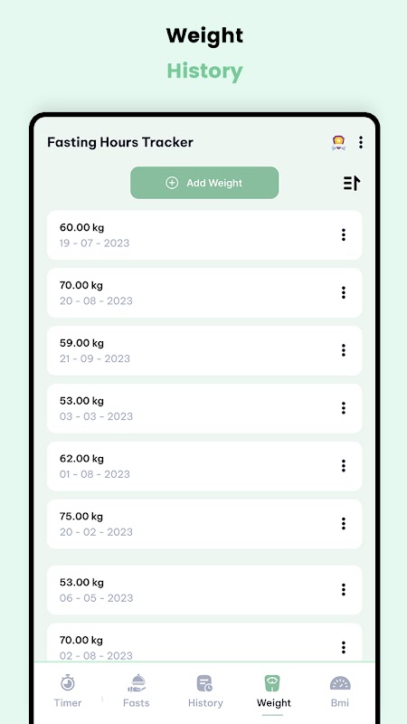 ファスティングの連続記録、完了したファスティング、そして体重の推移を時系列で確認できます。詳細なログと個人的なメモを含むファスティング履歴を保存・閲覧し、各フェーズでの気分を追跡できます。