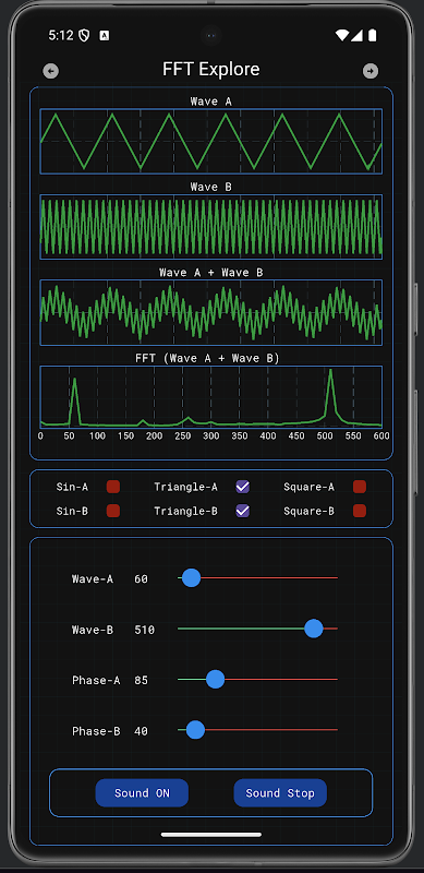 FFT Explorerを使用すると、1〜60サイクルの2つの独立した波、sin、三角形、または正方形と、0〜2piの位相をインタラクティブに生成できます。両方の波の合成のFFTが表示されます。波A、波B、AとBの複合和、および複合のFFTを示す4つのグラフがあります。 4つのウェーブコントロール、Aサイクルとフェーズ、Bサイクルとフェーズ、およびウェーブタイプを選択するためのコントロールがあります。すべてのグラフはインタラクティブであり、ユーザーがパラメーターを変更するとすぐに表示されます。