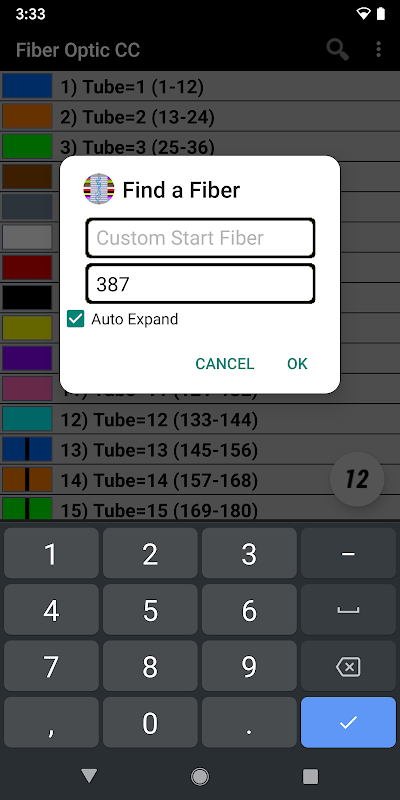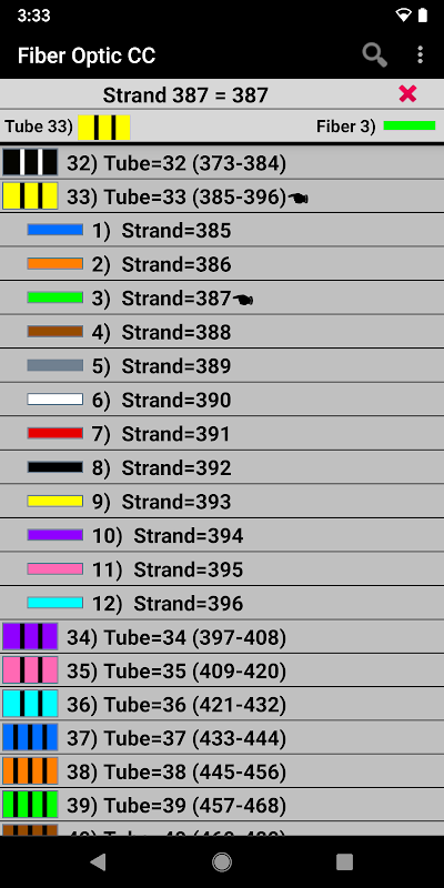 アプリで使用する必要はありませんが。カウント入力画面で、選択したグループサイズに分割できる完全な複雑なケーブルカウントを入力できます。次に、「カラーコード」ボタンを選択して、カスタムケーブル数を使いやすい拡張ファイバーチャートに配置できます。最大3456Fまでのサイズの光ファイバーケーブルで、ルーズチューブまたはリボンケーブルの光ファイバーカラーコード、鞘の数、および独自に入力した複雑なケーブル数を見つけることができる場所。