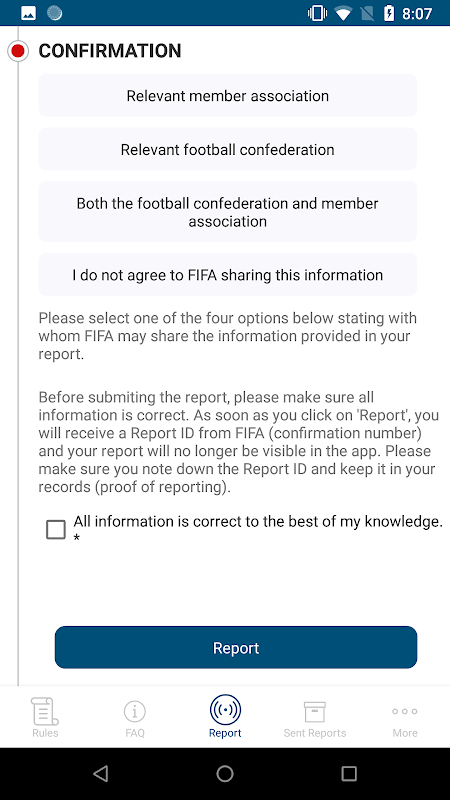 モバイルアプリはFIFAとエンドユーザーの間で機密と安全な通信チャネルを提供するように設計されています。アプリのコア機能は、サッカーの整合性に影響を与えるルールに関連する詐欺、八百長や侵害を賭けについての情報に関するとともに、それらのチーム、選手やマッチオフィシャルで完了する必要が簡単なフォームです。証拠が捜査にサポートするために、音声やカメラ機能を使用して送信することができます。チーム、選手や試合の職員は、彼らがルールを理解し、また、FIFAのニュースフィードへのアクセスだけでなく、アプリそのものに関するいくつかの有用なFAQを持っていることを確認するためにここにFIFA規律規範と倫理のFIFAコードを見つけることができます。