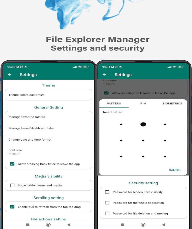 This app also contains multiple powerful security-related features like password-protecting hidden items, deleting files, or on the whole app using a pattern, pin, or fingerprint to keep your data private.