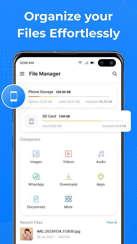 ファイル マネージャーは、複数の日常的な操作をサポートする強力でシンプルなインターフェイスのファイル マネージャーです。ファイル マネージャーを使用すると、ファイルを整理して簡単にアクセスできるようになります。 Whatsapp、メッセンジャー、Facebook、Instagram だけでなく、音楽、ビデオ、画像、ドキュメントなどの独自のファイル分類をサポートし、携帯電話の管理に役立ちます。同時に、携帯電話のスペースを解放するのに役立つ専門的なクリーニング機能もサポートしています。
