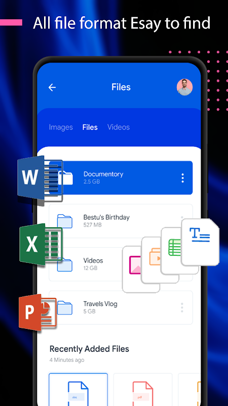 -Categorize all files into Downloads from internet, Bluetooth from nearby devices, Images, Pictures, Videos, Movies, Audio , Music, Documents (pdf, xls, ppt etc), Archives (zip, rar etc) and APK.