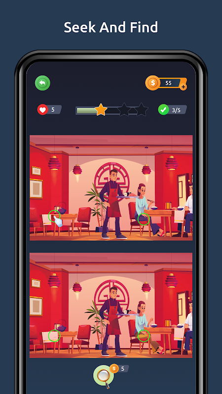 5つの違いを見つければ、5つの命が手に入る。コインガイドを使って。レベルアップする準備はいい?今すぐ始めよう!