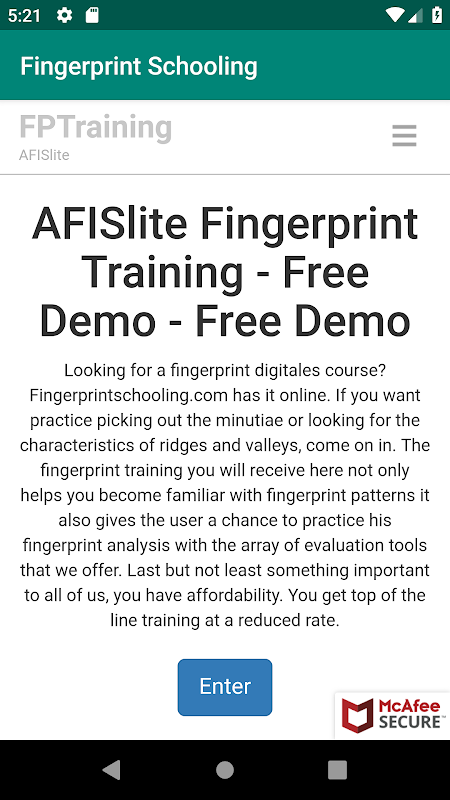 アプリでは、野心的な人が指紋に関するすべてを学ぶことができるウェブサイトをフィンガープリントスクーリングに連れて行きます。彼らは指紋をマークし、指紋のさまざまな関連ポイントを認識することを学びます。これはすべての年齢のための教育プログラムです。このウェブサイトは、ノートブックまたはPCを使用して最もよく利用されます。ウェブアドレスはhttps://fingerprintschooling.comです