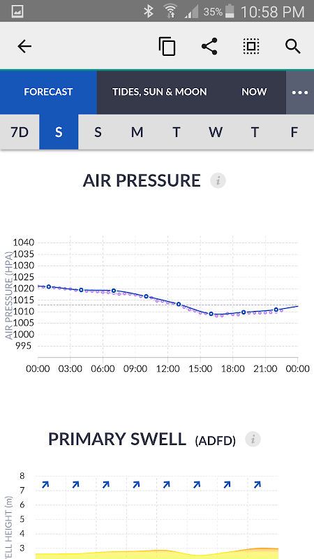 リアルタイムオーバーレイは実際の風速と突風速度を表示するため、天気が予想どおりに追跡されているかどうかを確認できます。 10日間の予報、気圧(気圧計)の予報、憩流の時間、月の満ち欠けなど、必要なものがすべて1ページに表示されます。