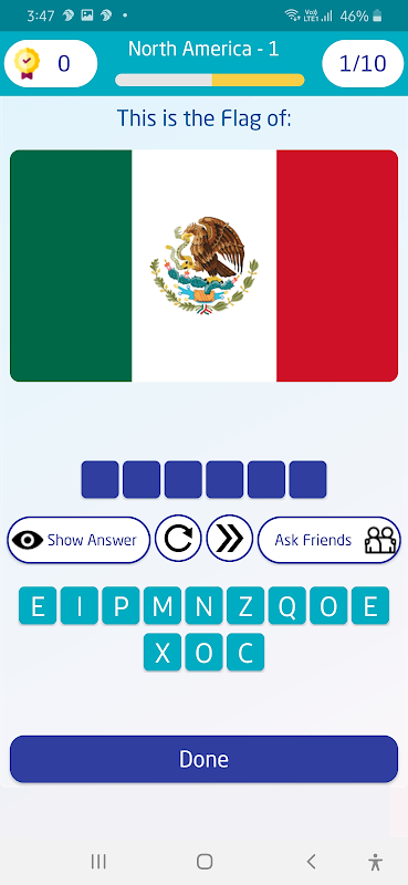Flags are grouped into continents, and each continent has many levels that start easy and becomes hard as each level completes.