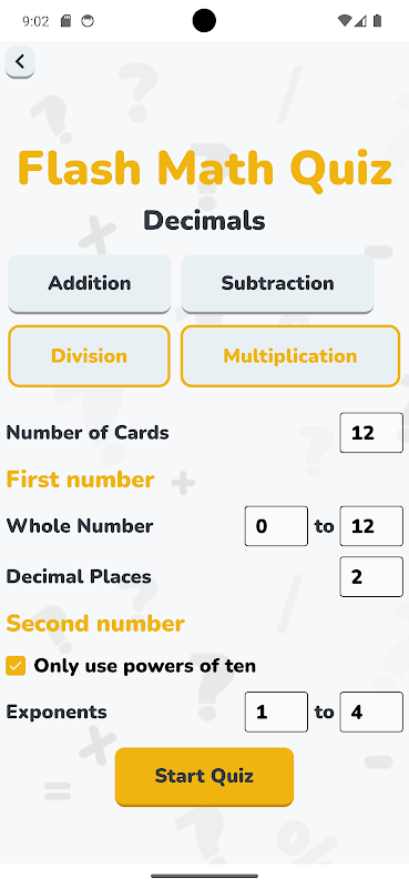 整数、整数、小数、分数の好みに基づいて、ランダムなフラッシュ カード デッキを生成できます。足し算、引き算、掛け算、割り算から選択し、各クイズのフラッシュカードの数を選択します。