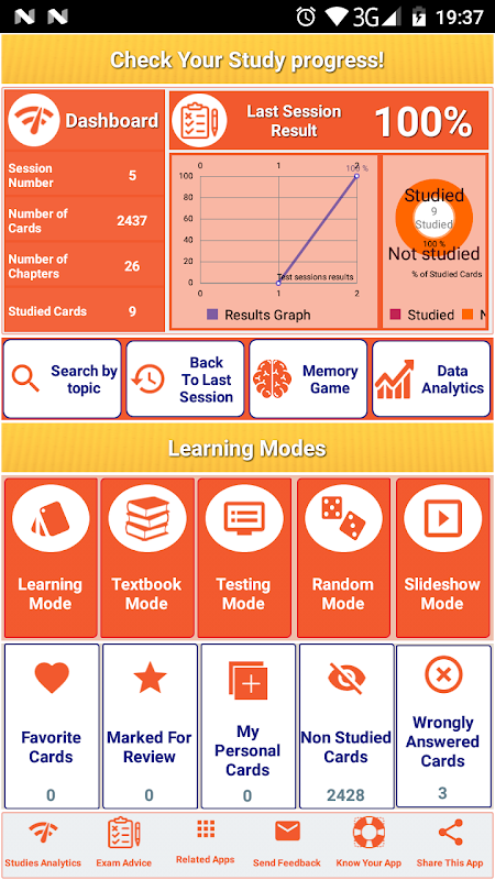 -5つの学習モード(学習モード、テストモード、配布資料モード、テストモード、スライドショーモード、ランダムモード)。