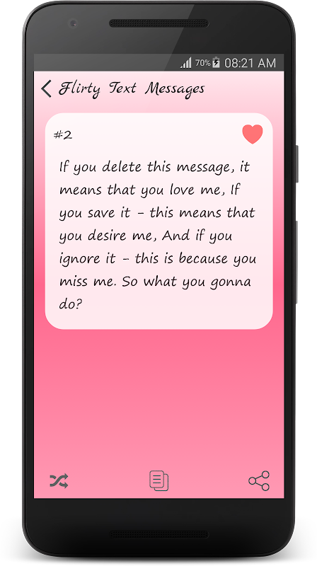 This Flirty Texts app is a collection of flirt sms, sweet sms, compliments, sweet text messages and cute flirty texts for him or for her.