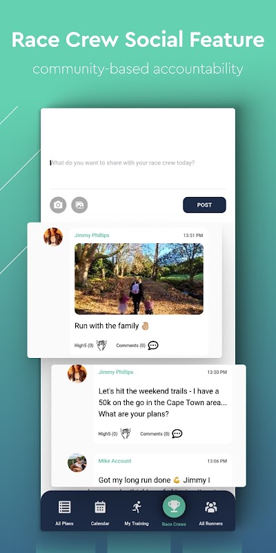 選択したトレーニングプランでは、Race Crewsソーシャル機能を介して、志を同じくするランナーのコミュニティに排他的にアクセスできます。これらは、あなたとまったく同じ距離またはレースをしている他のランナーであり、これらのランナーだけが場違いに感じることはなく、あなたに違いをもたらす情報しか得られません。他の人がその日のトレーニングについてどう思うかを確認し、質問をし、写真と進捗状況を共有し、次のレースについてチャットします(滞在場所、登録時期)など。私たちは皆、ランナーとして学び、向上するためにここにいます。これは、説明責任と楽しみを持っていくための素晴らしい方法です。