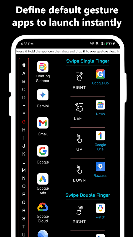 ジェスチャー - アプリに事前ジェスチャーを割り当て、トリガーから直接項目を開始します。任意のアプリのジェスチャーを選択し、1 回の素早い動作で起動します。