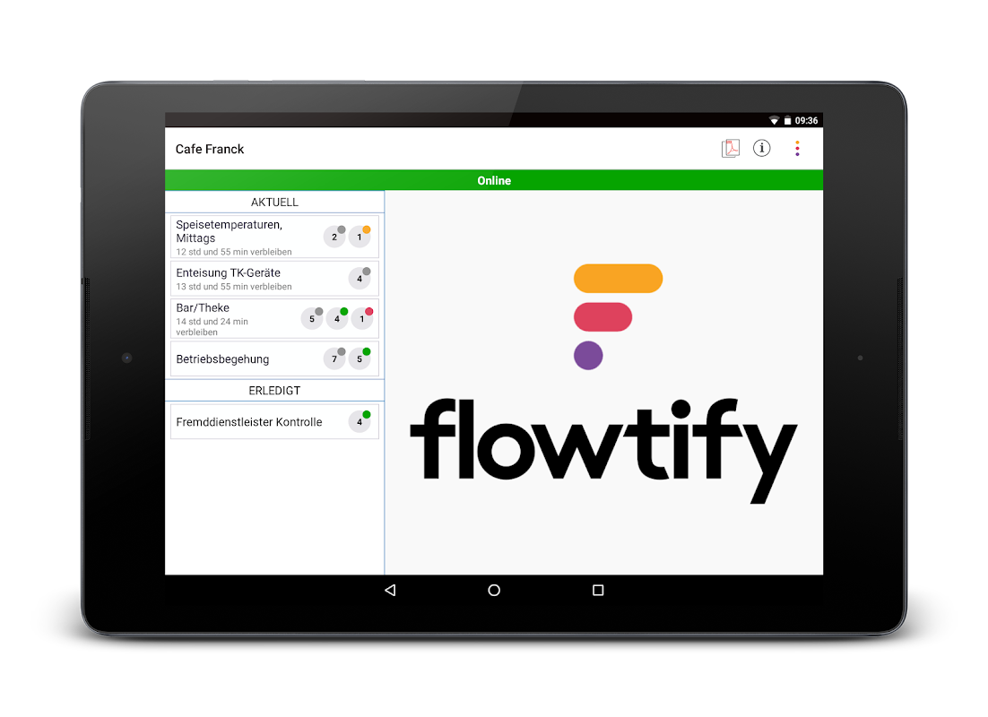 Bei Flowtify handelt es sich um eine mobile Applikation in Verbindung mit einem Web Dashboard mit monatlichen Kosten. Die Lizenzgebühr ist abhängig von der Anzahl der Betriebsstätten und verwendeten Tablets / Smartphones.