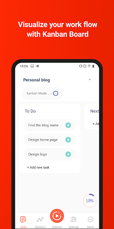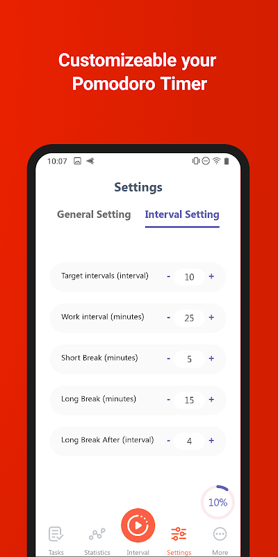 私たちのアプリはポモドーロ タイマーとして機能し、タスクを個別の間隔に分割します。その間に短い休憩があり、4 つの間隔の後に長い休憩があります。特定のニーズに合わせて、これらのインターバル、短い休憩、および長い休憩の長さをカスタマイズできます。こうすることで、集中して生産性を高めながら、リラックスして充電する時間を持つことができます。