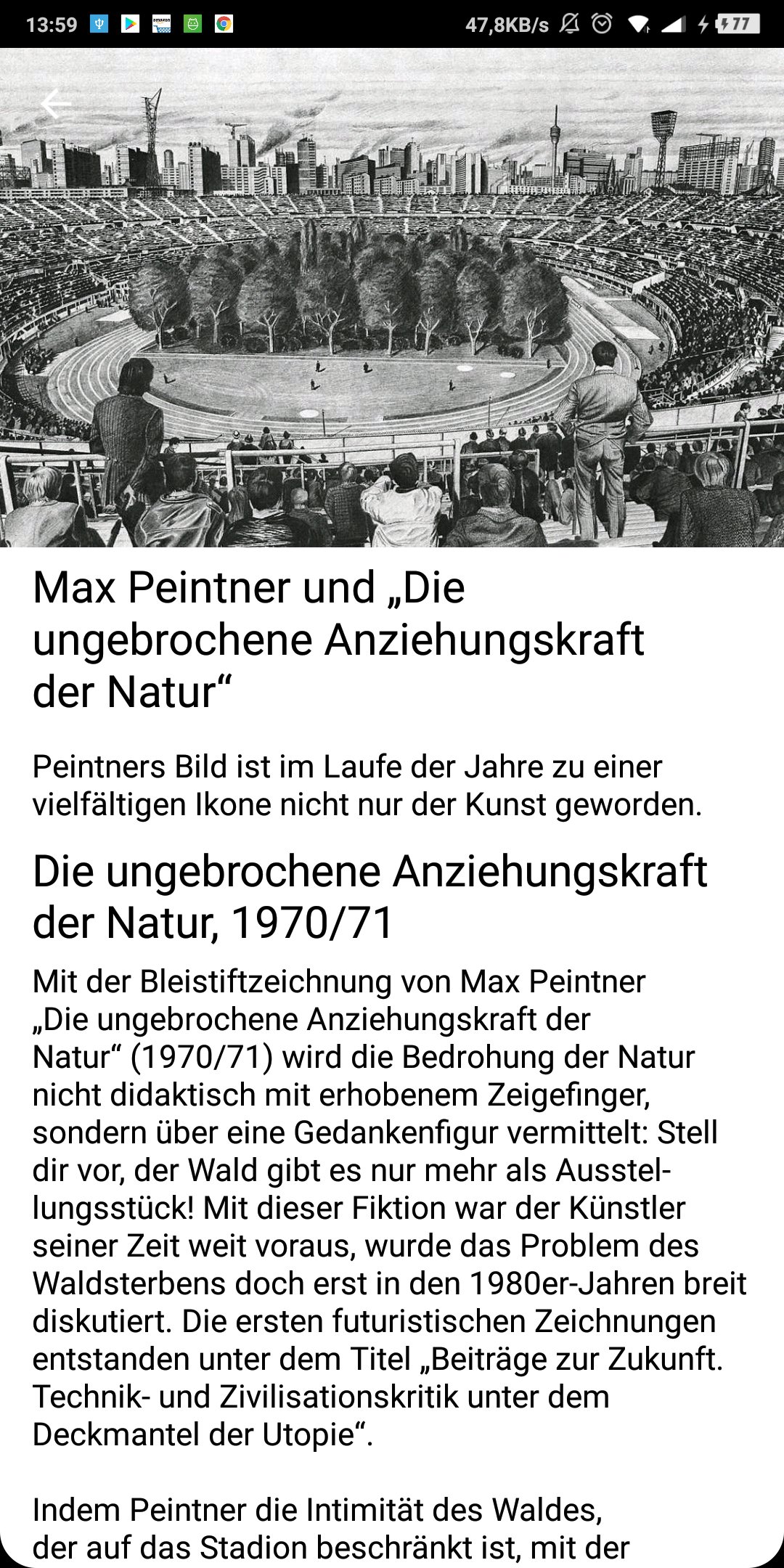 Am 8. September 2019 wird im Klagenfurter Wörthersee-Stadion (AT) das größte bisher in Österreich realisierte Kunstprojekt im öffentlichen Raum stattfinden. Ein authentischer Mischwald wird das Fussballstadion in Besitz nehmen. Bleib mit der For Forest App am Laufenden über den Fortschritt des Projekts, lerne das vielfältige Rahmenprogramm kennen, erhalte exklusive Interviews mit den Künstlern und informiere dich über verschiedenste Themen rund um For Forest.\n\n For Forest - die ungebrochene Anziehungskraft der Natur, inspiriert von der Zeichnung „Die ungebrochene Anziehungskraft der Natur“ von Max Peintner bespielt Klaus Littmann das Wörthersee Stadion im September / Oktober 2019. Von den Rängen aus können die Zuschauer das Baumspektakel Tag und Nacht bei Natur- oder Flutlicht im Stadion bestaunen.