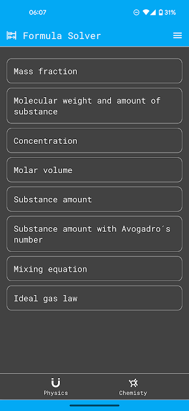 Formula Solver は、物理的および化学的計算のためのシンプルで使いやすいアプリケーションです。物理学と化学の 100 以上の式が特徴で、式の画像、式内の要素の説明、計算の基本単位だけでなく結果単位のセレクターも含まれています。物理学の公式は、電気、磁気、流体力学、力学、振動力学、波力学、音響力学、分子物理学、熱力学、光学、量子物理学、および特殊相対性理論を含む 12 のカテゴリに分類されます。このアプリケーションには、いくつかの数式の段階的な説明も含まれています。物理学と化学の方程式を解くのに助けが必要かどうかに関係なく、フォーミュラ ソルバーは科学愛好家や学生にとって便利なツールです。