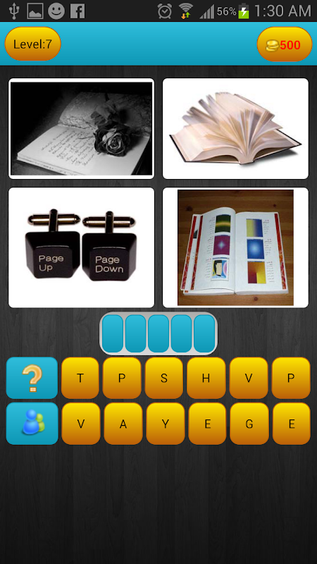 The game contains of multiple levels, in each level, 4 pics are shown and the user should guess what is the common word between all 4 pics.