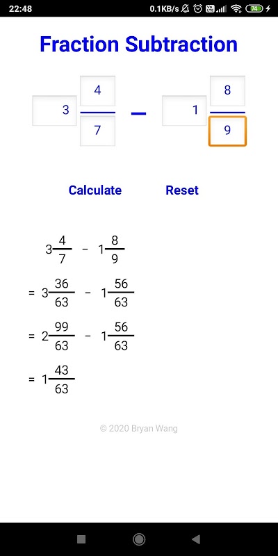 このアプリは、2つの分数(または混合数)を段階的に減算する方法を示します。一般に、必要に応じて、2つの分数を展開して共通の分母にし、次に減算します。答えはその最も単純な形で表現されます。
