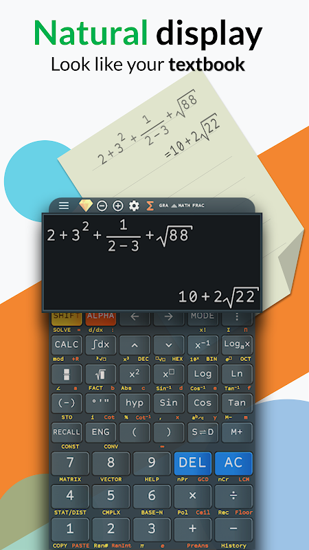 * Natural Displayは、あなたの教科書に表示されるルーツや分数、平方根、微分、積分、行列などの数式を表示します。結果が分かりやすいため、理解度が向上します。