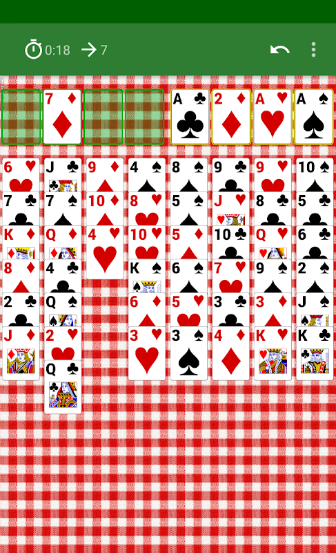 あなたは、8列にカードを移動させることができます。あなただけの、その値が1ポイント高く、かつ異なる色で(例えば、5赤は6黒になる)である別のものの上にカードを置くことができます。また、一時的にカードを残して4無料の細胞を有します。